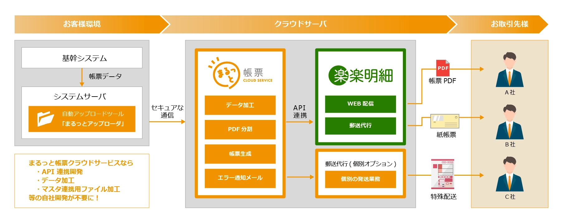 このコア技術を軸に、Web配信や標準的な郵送代行は「楽楽明細」、特殊な印刷・郵送は「提携印刷業者」といった、各分野の専門サービスとシームレスに連携。お客様のあらゆるニーズに応える統合ソリューションとして提供します。